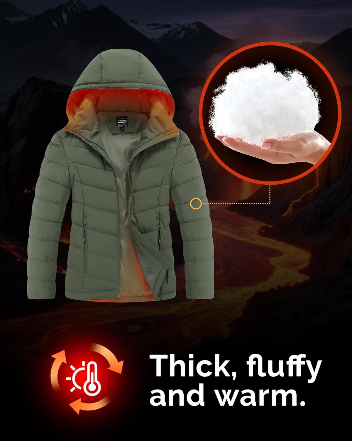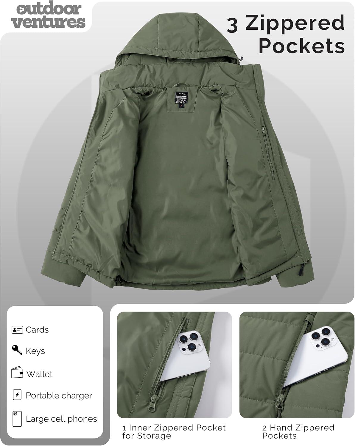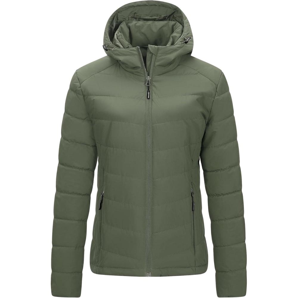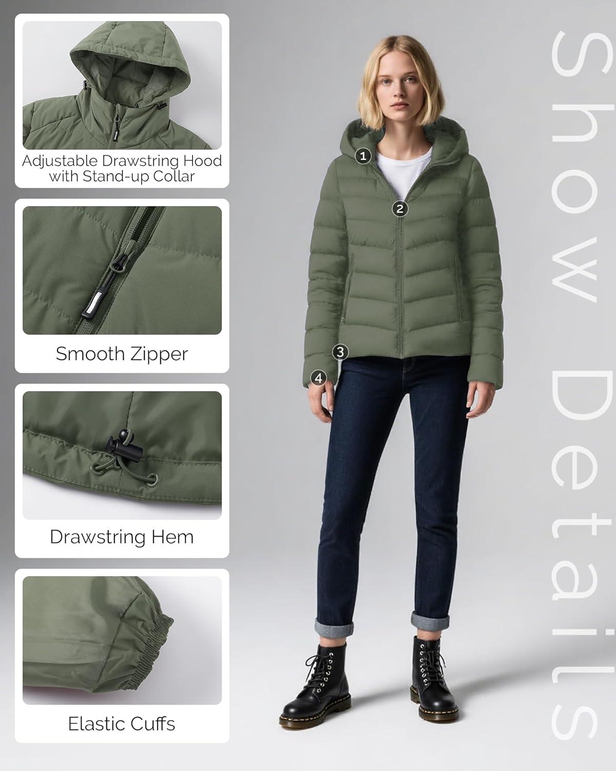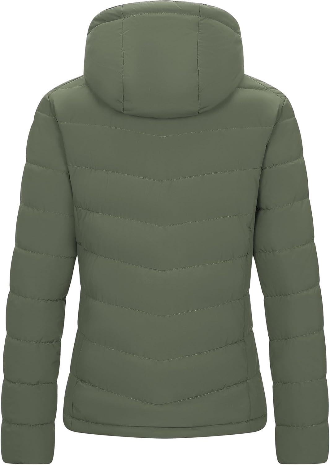Outdoor Ventures Women’s Hooded Puffer Jacket Waterproof Lightweight Full-Zip Warm Quilted Winter Coat(Olive Green)